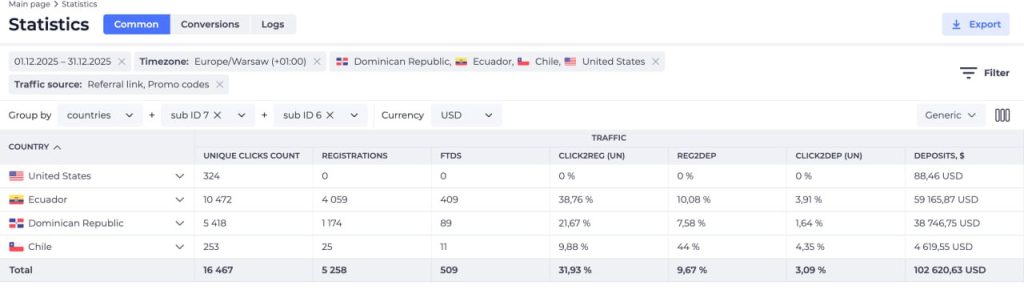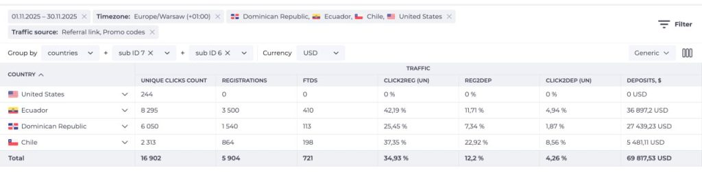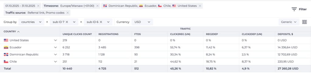 Октябрь: Рекламодатель оценил качество и выделил еще по $4k на два новых гео - Чили и Доминикану (суммарно $12k бюджета). Наш трафик принес депо на $27k.