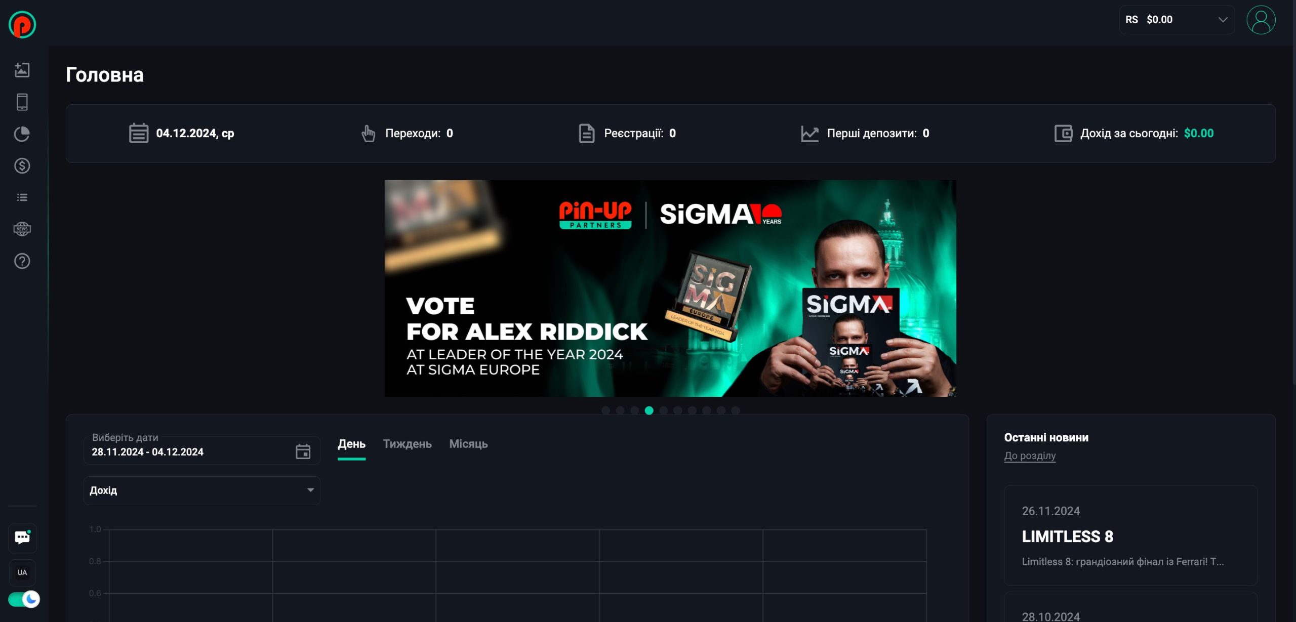 Личный кабинет Партнеры PIN-UP создан для максимально удобной навигации и анализа. На главной странице сразу видно статистику за последние сутки и график доходов - все максимально понятно и наглядно.
