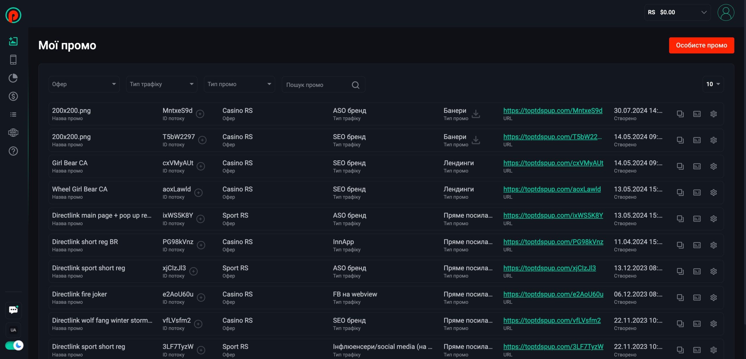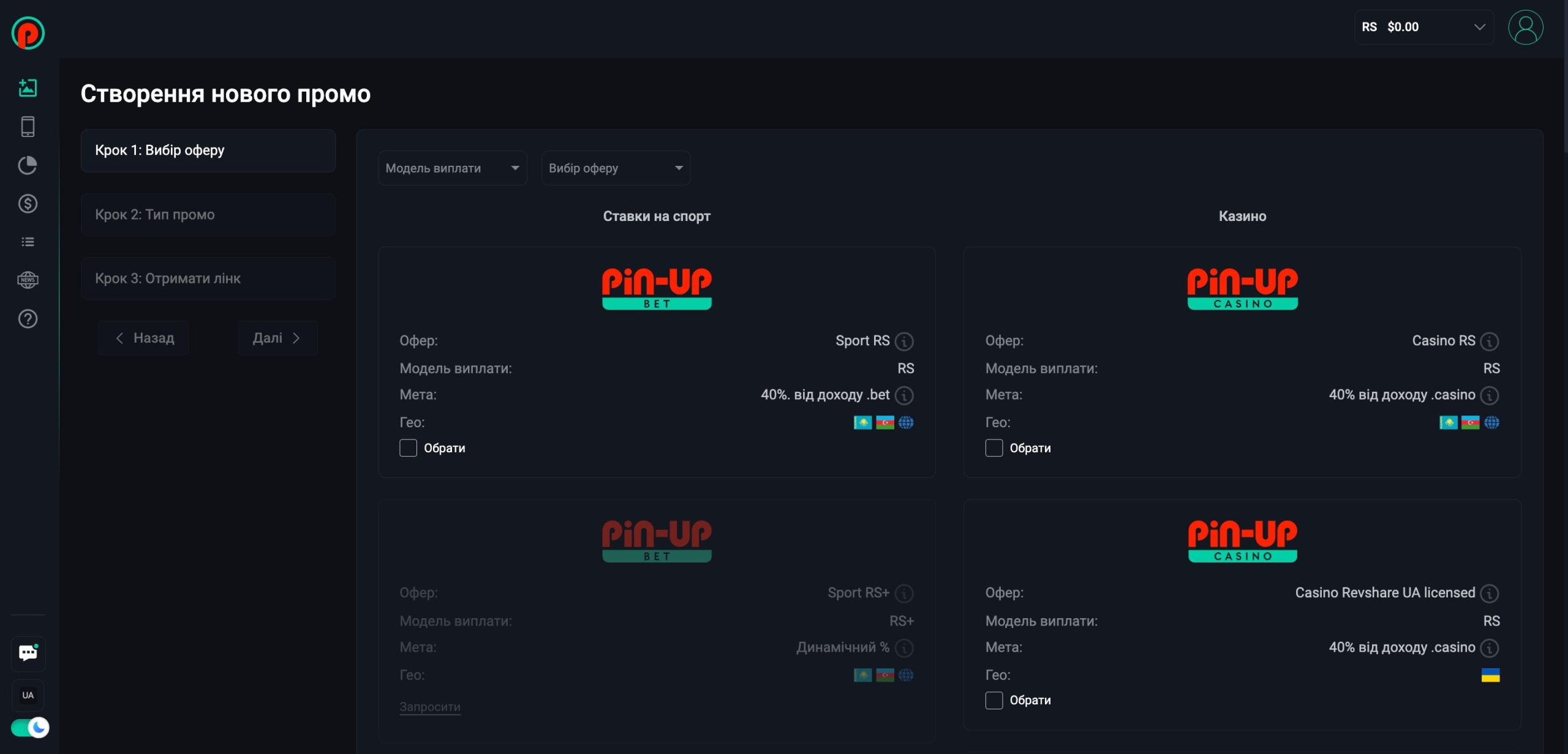 В разделе "Промо" (расположен в сайдбаре слева) вебмастера начинают свою работу с трафиком. Здесь представлены промо-материалы от Партнеры PIN-UP и ссылки для рекламных кампаний.