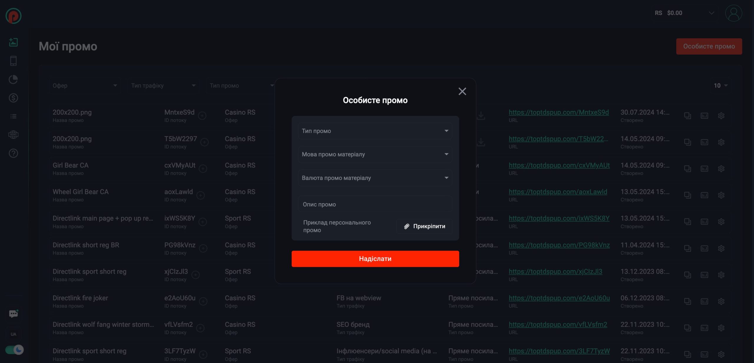Если нужно что-то особенное, всегда можно заказать персональные промо. Нажав на кнопку "Личное промо" в разделе "Мои промо" нужно указать тип, язык, валюту и свои пожелания, и команда Партнеры PIN-UP создаст материалы по вашим запросам.
