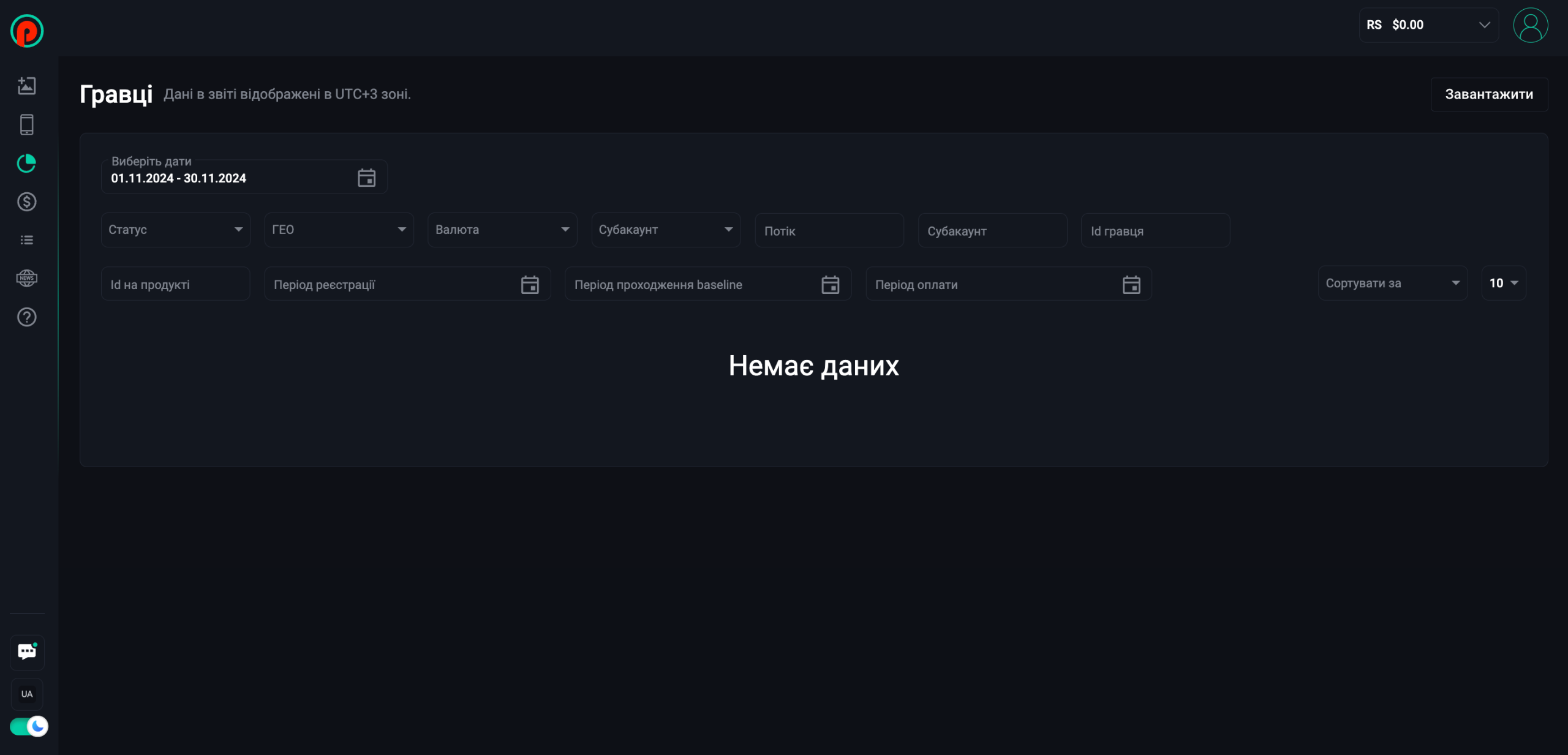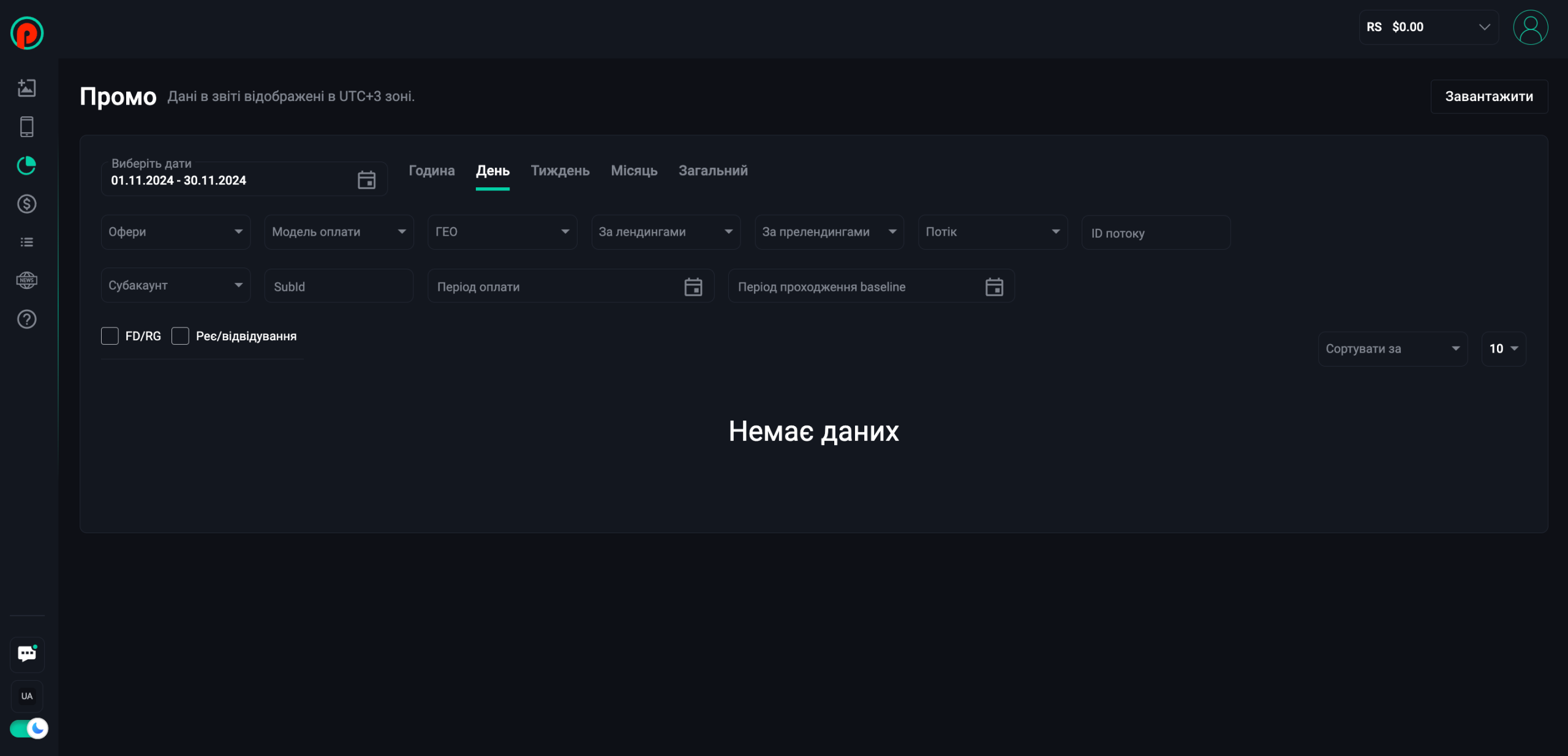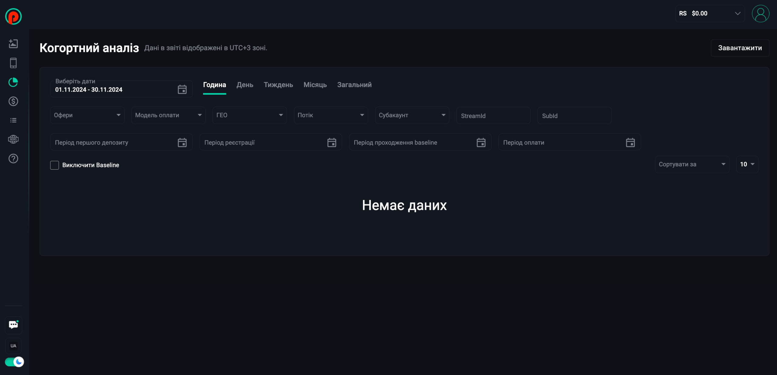 Позволяет анализировать трафик с помощью таблиц и группировок по времени, ГЕО, тарифам, потокам и субакаунтам. Включает данные о регистрациях, депозитах, ставках, игровой активности и доходе.