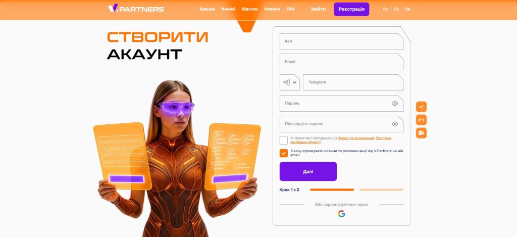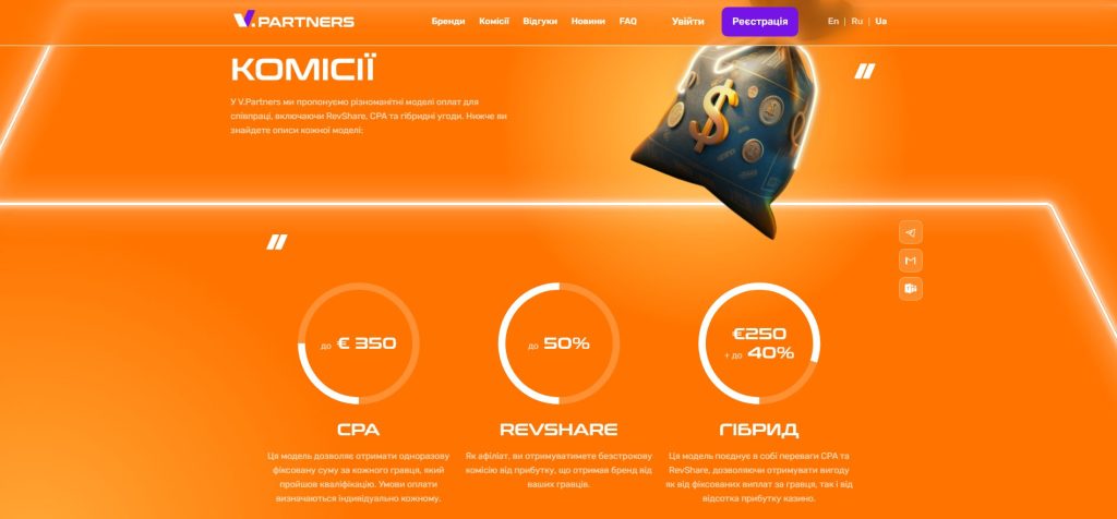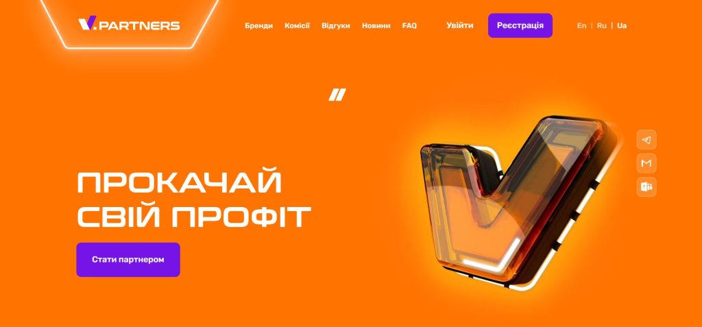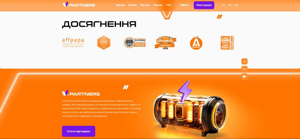 Сразу доступна и языковая панель (EN | RU | UA), которая охватывает всю основную аудиторию. Визуально все выглядит чисто: оранжевый фон, объемные неоновые элементы и акцентная кнопка "Стать партнером".