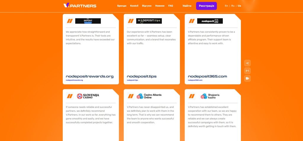 У V.Partners настолько много отзывов от партнеров, что это уже выглядит как отдельный раздел доверия. Nodeposit-платформы, локальные казино, европейские коллаборации - все отмечают одно: простота старта, прозрачная коммуникация и результаты, превышающие ожидания.
