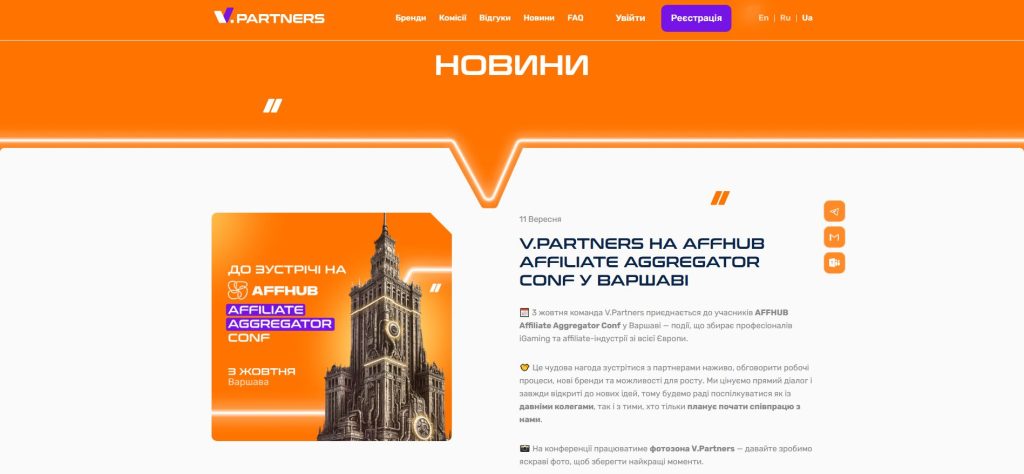 Ближайший пример - 3 октября в Варшаве команда V.Partners будет на AFFHUB Affiliate Aggregator Conf, где сможете лично пообщаться с их менеджерами.