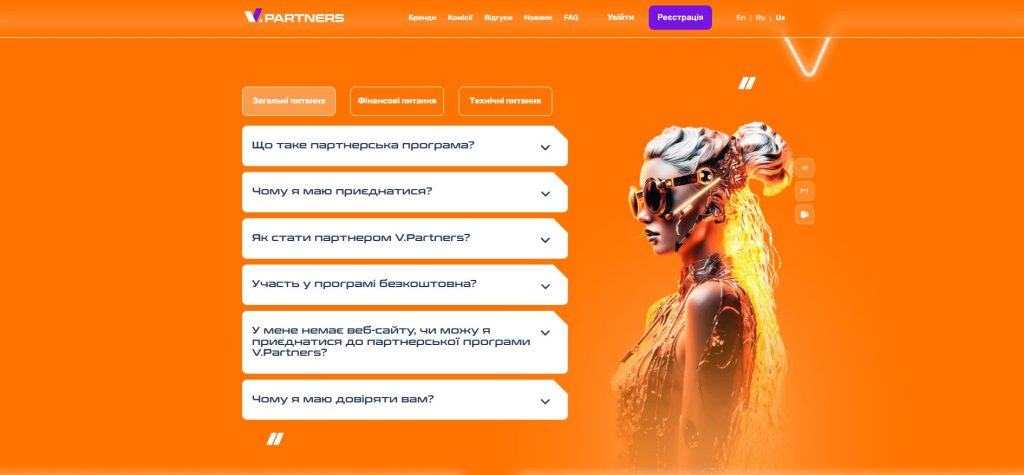 В V.Partners все сделано так, чтобы партнер быстро находил ответы на свои вопросы. Раздел FAQ удобно поделен на темы: