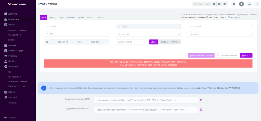 Обновление данных происходит примерно каждые 15 минут, а это значит, что партнер видит динамику почти в реальном времени и может быстро реагировать на изменения.