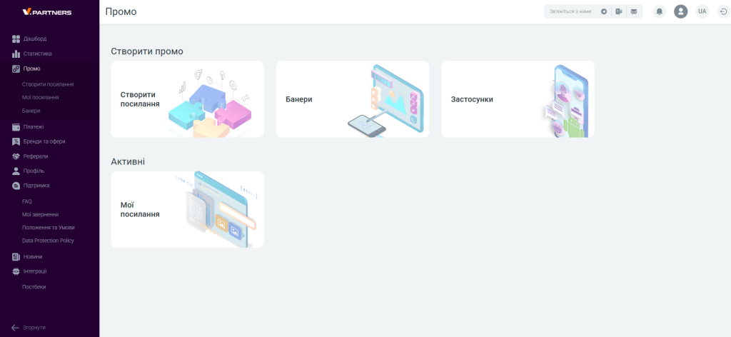 В разделе "Промо" V.Partners сделали акцент на простоте и гибкости. Партнер получает все необходимое для быстрого старта и масштабирования кампаний: