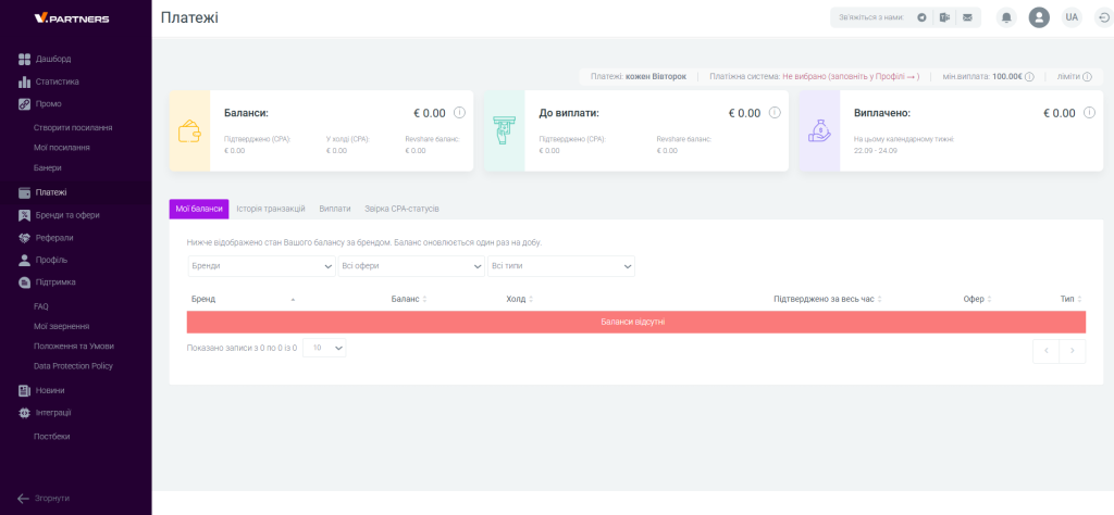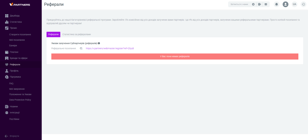 Левая панель навигации тоже сделана логично: доступ к статистике, промо-материалам, брендам, выплатам, реферальной программе и даже интеграциям. Каждый раздел открывается в один клик, без лишних переходов.