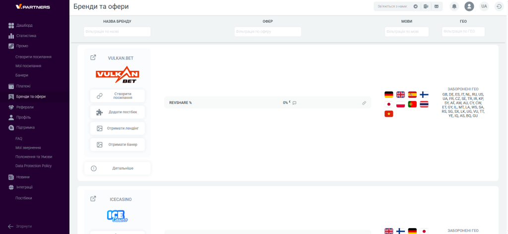 Этот раздел удобен тем, что все собрано в одном месте: не нужно переключаться между разными вкладками или уточнять информацию у менеджера. Если работаешь с несколькими брендами - видно полную картину сразу. Также в карточках отображается RevShare % - то есть можно мгновенно понять, какие условия действуют для конкретного оффера.