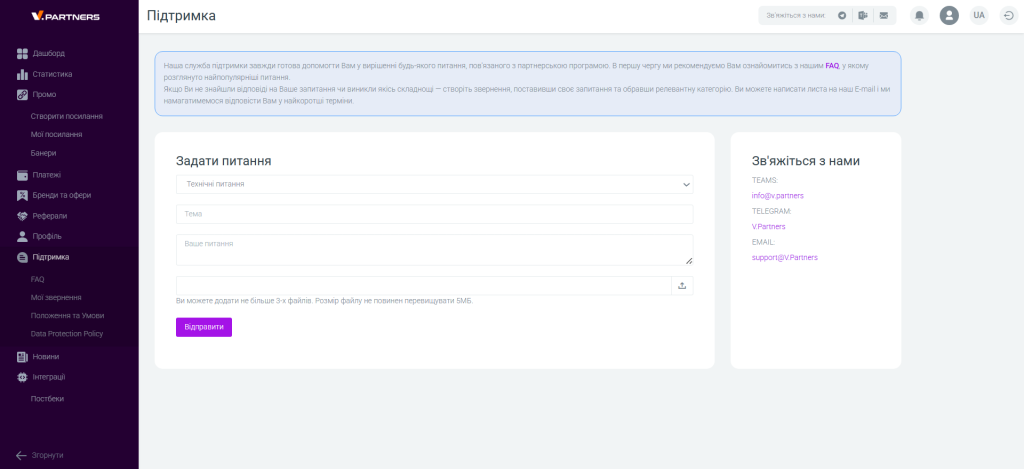 У V.Partners сервис построен так, чтобы партнер никогда не оставался один на один с вопросами. В кабинете доступна форма для быстрого создания обращения - можно выбрать категорию (технические, финансовые или организационные вопросы), добавить тему и описание, даже прикрепить файлы. Это удобно, если надо сразу показать скрин или документ.