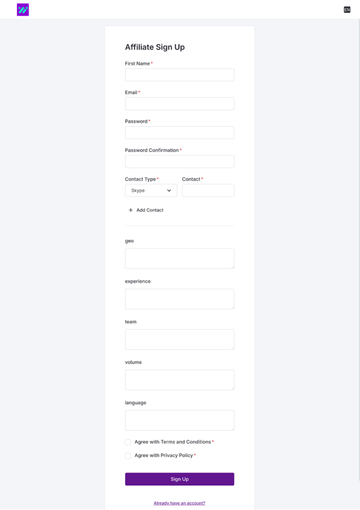 В правом верхнем углу на сайте WINEX Affiliates нажмите на кнопку «SIGN UP». Далее нажимаем «Affiliate Sign Up». Заполните простую форму регистрации с обязательными полями: First Name, Email, Password, Password Confirmation, Contact Type, Contact. Рекомендуется заполнить и дополнительные поля.