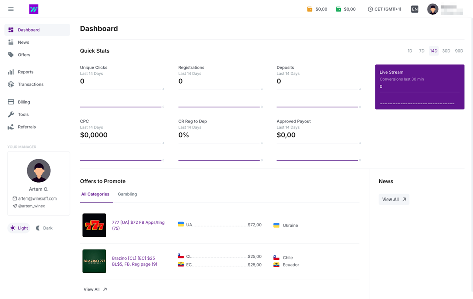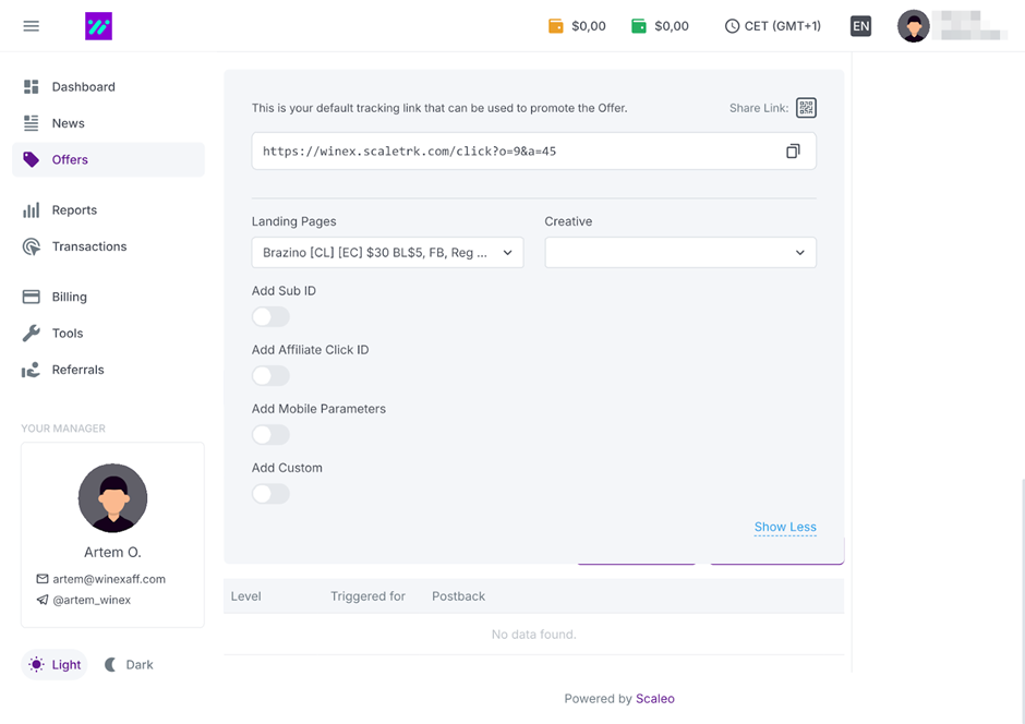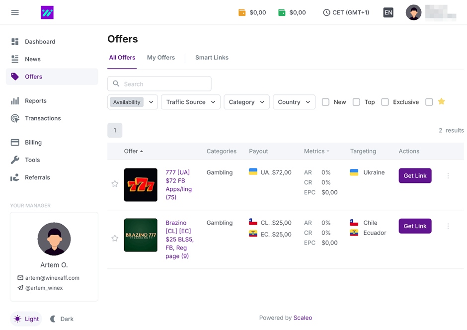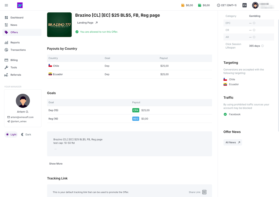 В партнерской сети большое разнообразие iGaming офферов. В разделе «Offers» представлены доступные продукты для рекламы. Напротив каждого оффера выводится краткая информация - название, ставка, ГЕО.