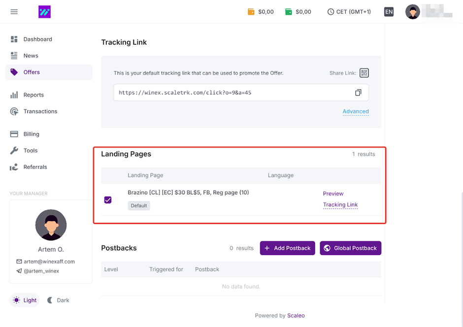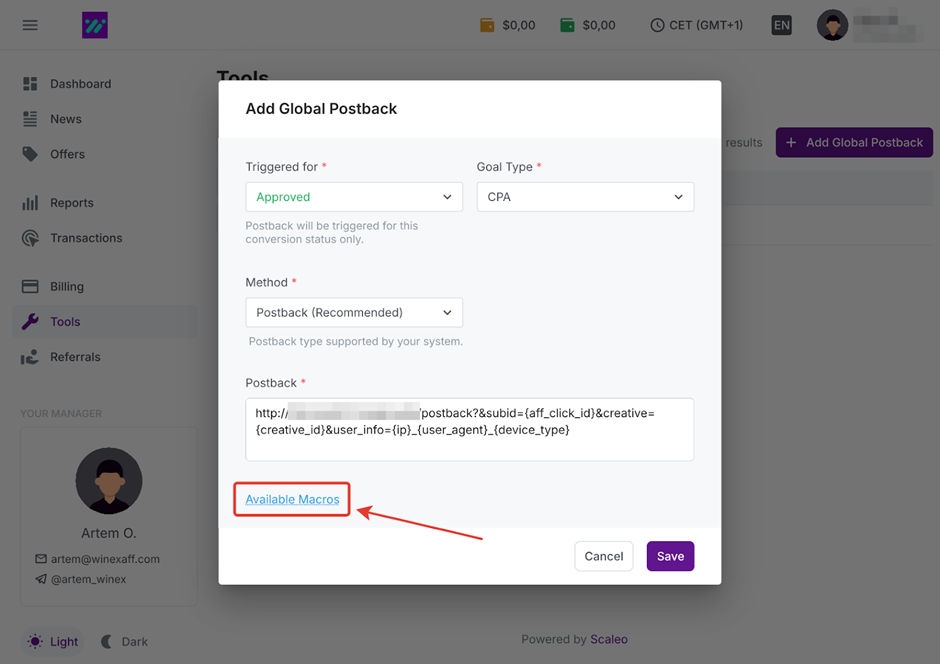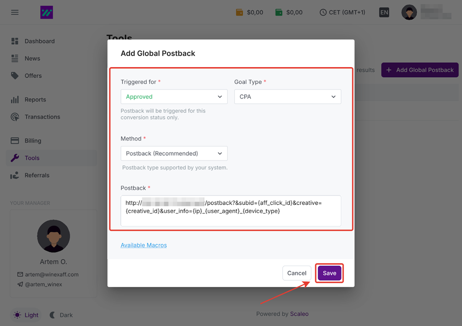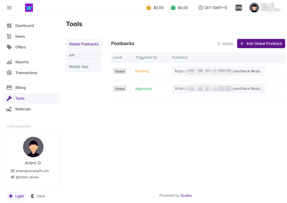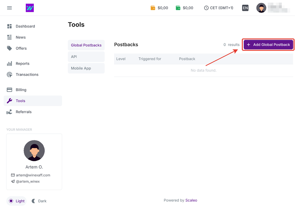 Для настройки postback-а, откройте WINEX Affiliates, перейдите на страницу «Tools» и нажмите «Add Global Postback»;