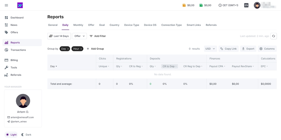 В WINEX Affiliates реализована детальная статистика по трафику и конверсиям. Статистику можно просматривать и анализировать по: General, Daily, Monthly, Offer, Goal, Country, Device Type, Device OS, Connection Type, Smart Links Referrals. В каждой статистике большое разнообразие дополнительных фильтров.